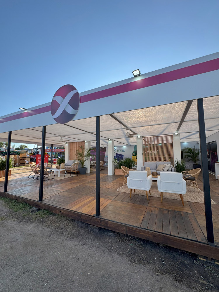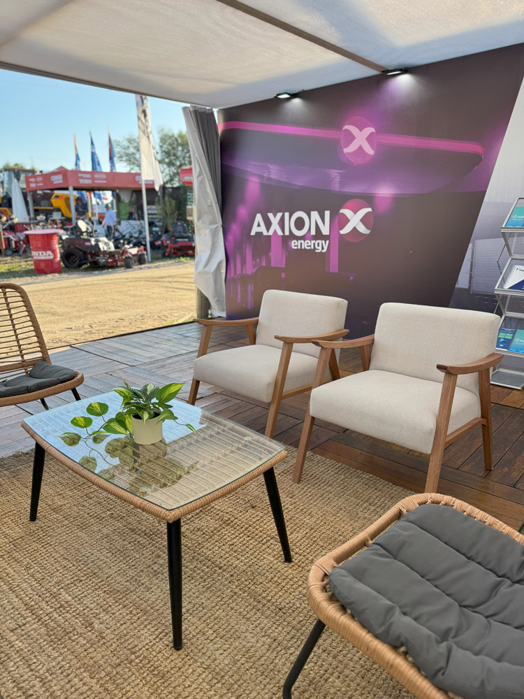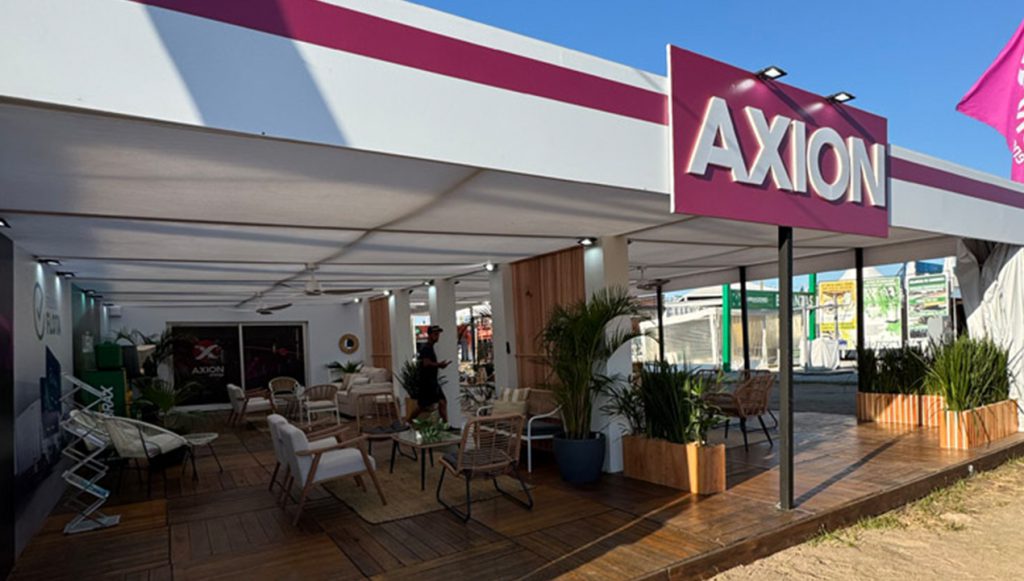 El stand de AXION presenta una propuesta elegante, funcional y orientada a brindar una experiencia confortable para el visitante. Con un enfoque en la hospitalidad y el branding visual, combina una estructura limpia con detalles cálidos en madera y vegetación natural, destacándose en el entorno ferial al aire libre.