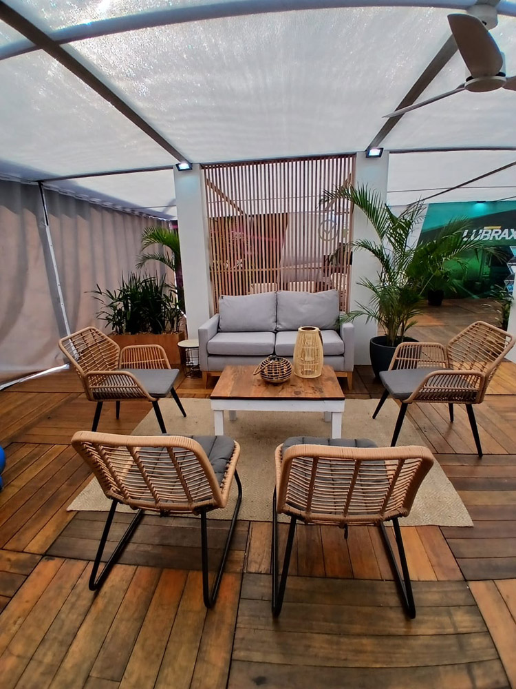 El espacio está cuidadosamente amoblado con sillones, sillas y mesas de estilo moderno, dispuestos sobre un deck de madera. La disposición sugiere una atmósfera relajada, ideal para reuniones, networking o descanso del visitante. La inclusión de plantas naturales en maceteros de madera agrega un toque de calidez y frescura al ambiente, integrando el stand con el entorno exterior.