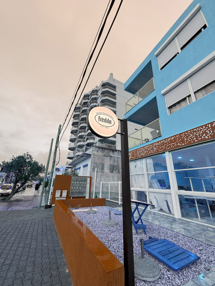 Ubicada en Piriápolis, la heladería Freddo se presenta con una estética moderna, luminosa y acogedora. La cenefa de aluminio compuesto ruteado y en forma de caja de luz, invita a probar los helados más ricos del balneario.