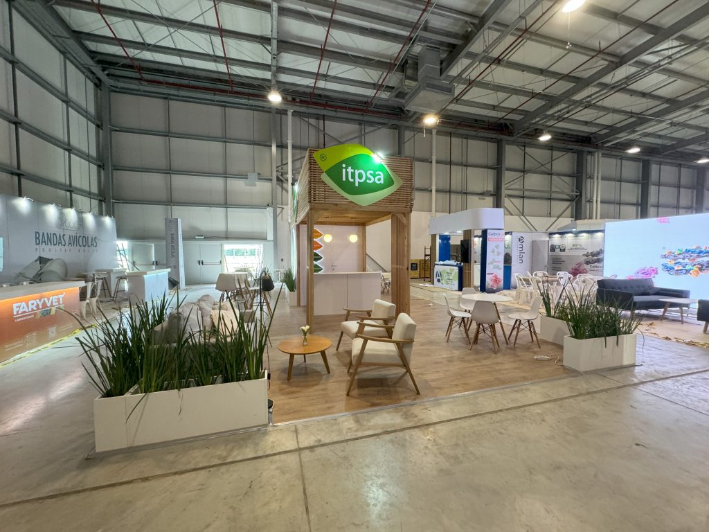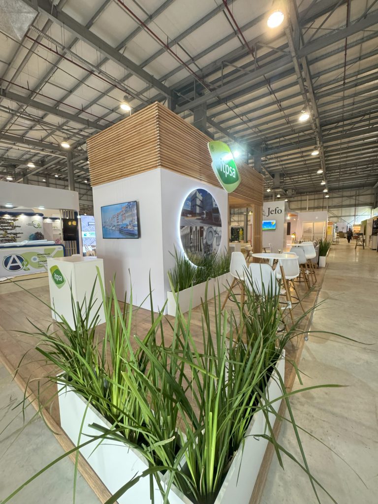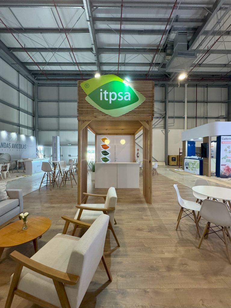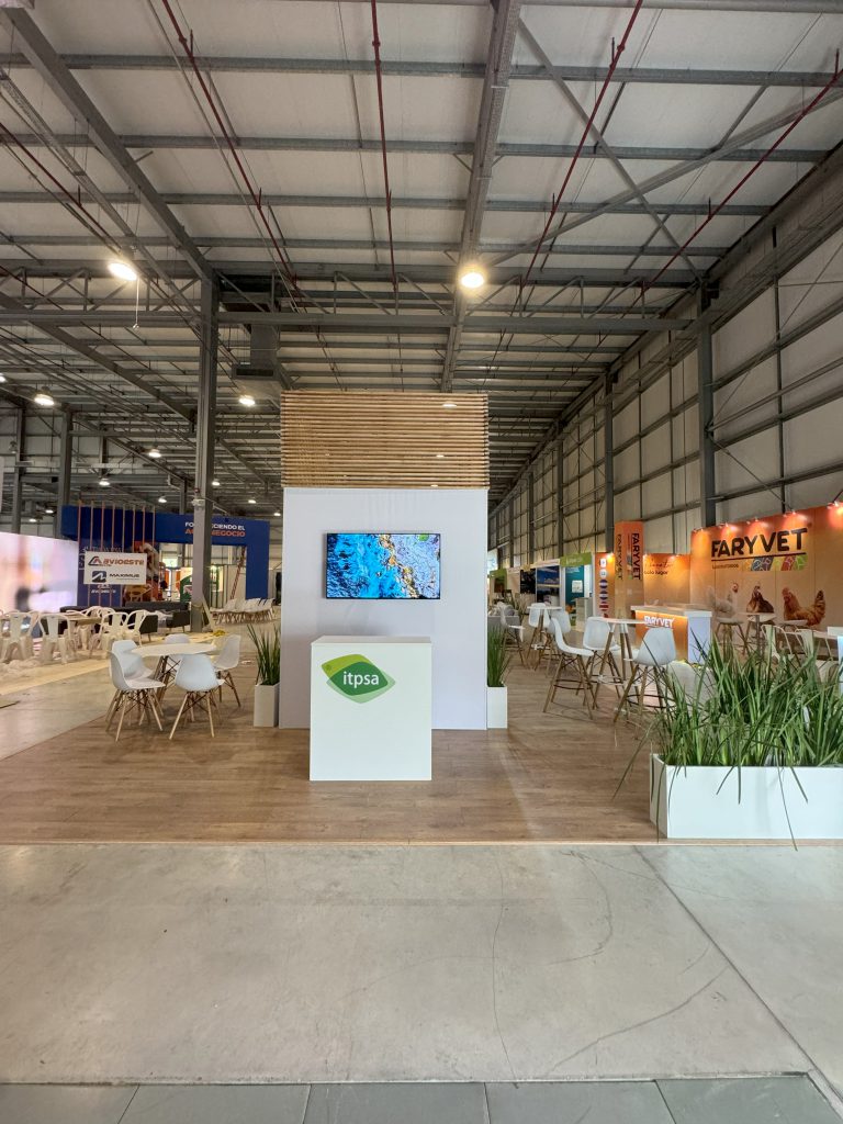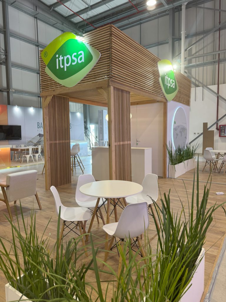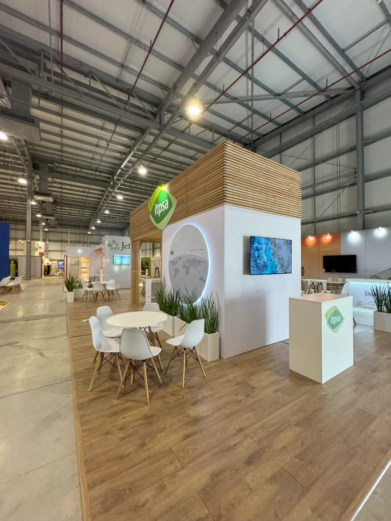 El stand de ITPSA se destaca por una propuesta arquitectónica limpia, cálida y contemporánea, que combina materiales naturales con un diseño funcional y bien distribuido.