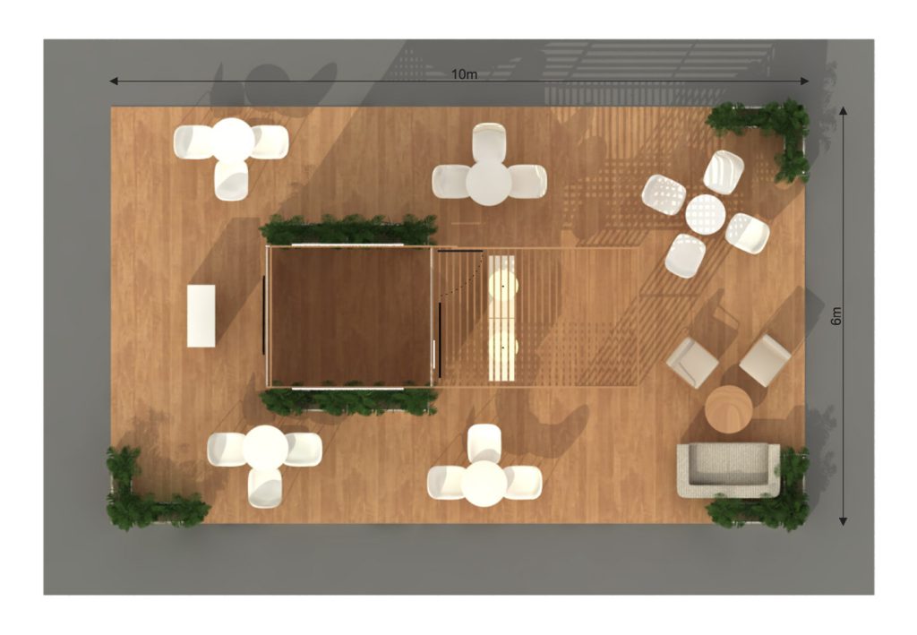 Se organiza de forma abierta y accesible, con distintas áreas pensadas para el encuentro y la conversación: mesas redondas con sillas blancas para reuniones informales, una zona de living con sillones y un pequeño lounge que invita a la comodidad. Todo el espacio está delimitado por maceteros con plantas naturales, que refuerzan una estética amigable y sustentable.